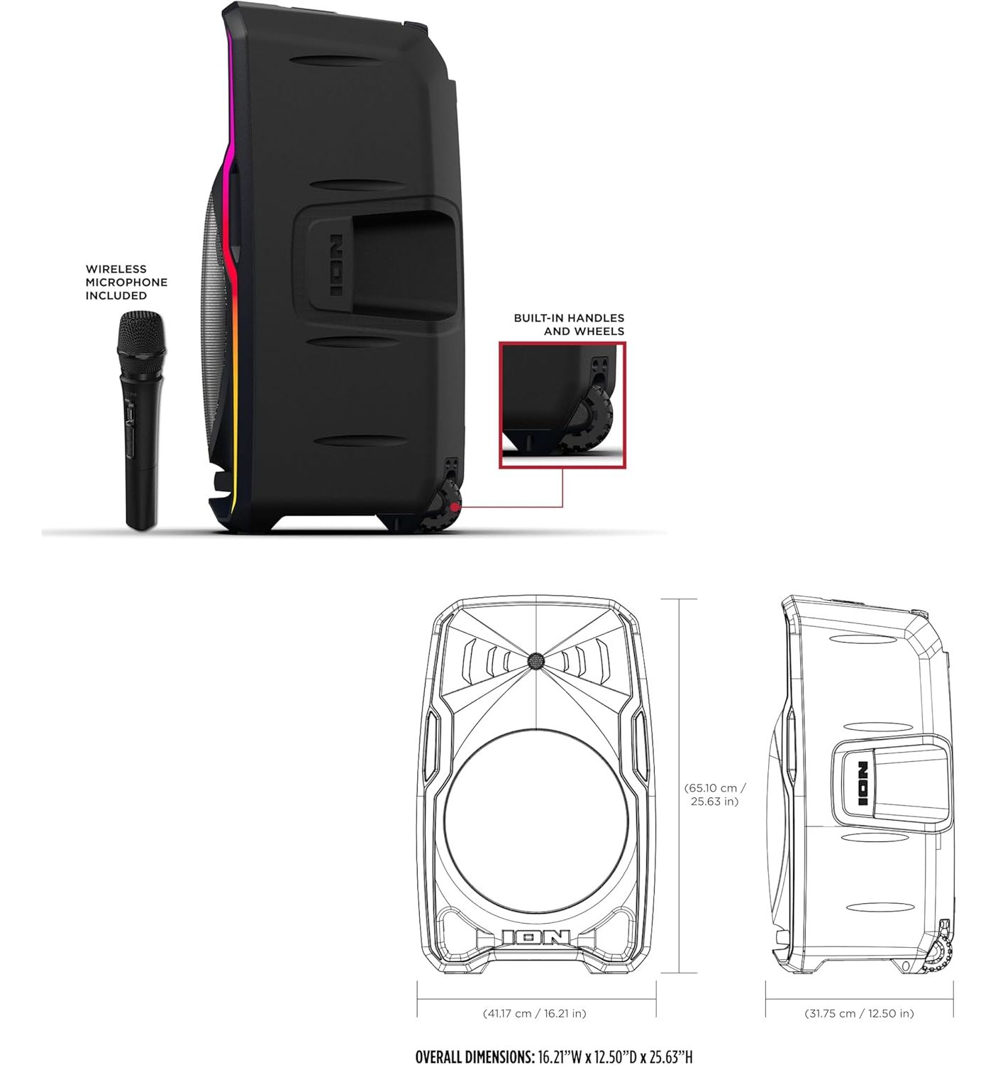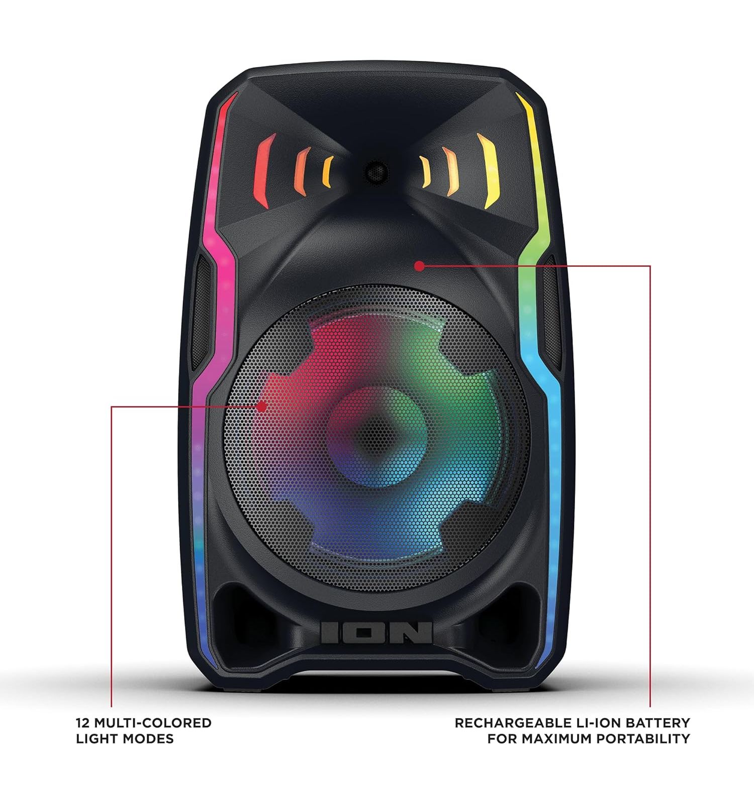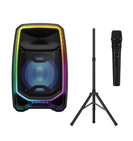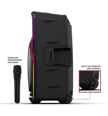 | Description | ION Audio Total PA Apex - 600W powered 12" speaker - Rechargeable Battery - Clear high-quality audio - Bluetooth wireless music playback - AUX, USB, & SD card input - FM radio - Multichannel mixer with volume, 2 XLR, 1/8" & 1/4" inputs - Programmable LED lights - 1 amp USB charging port - Handle and wheels for transport - Includes 1 wireless mic and tripod stand - Refurbished |