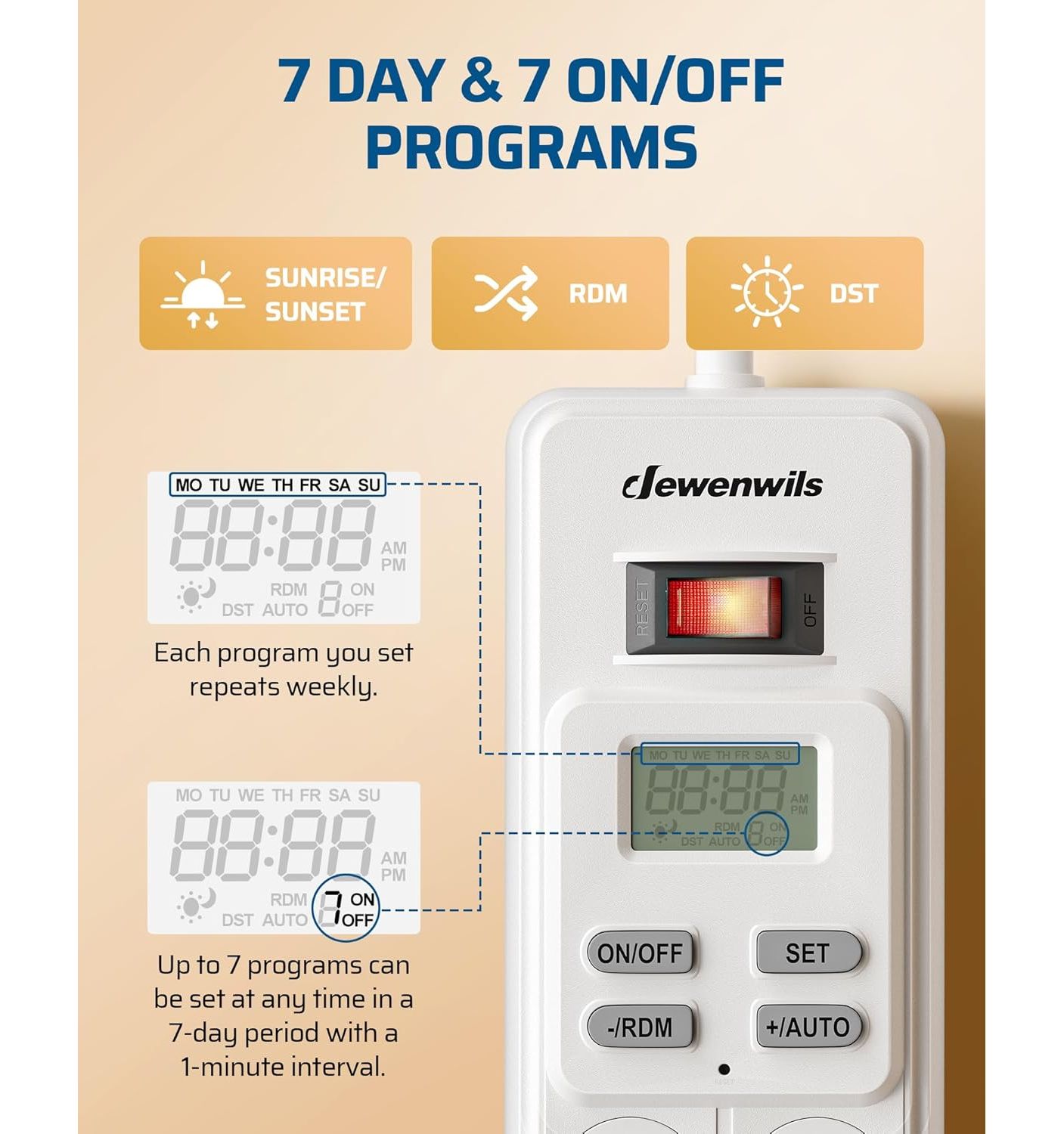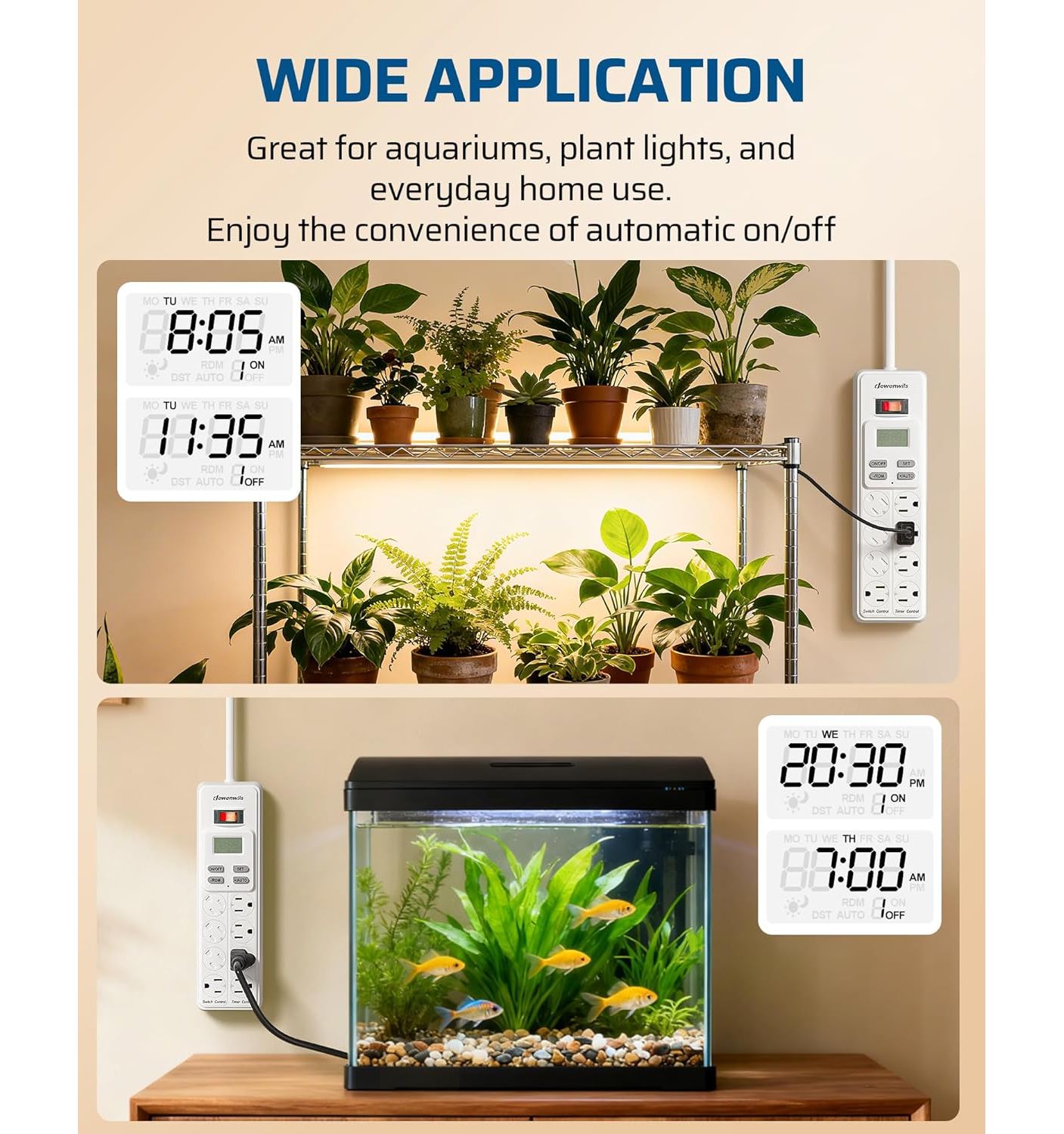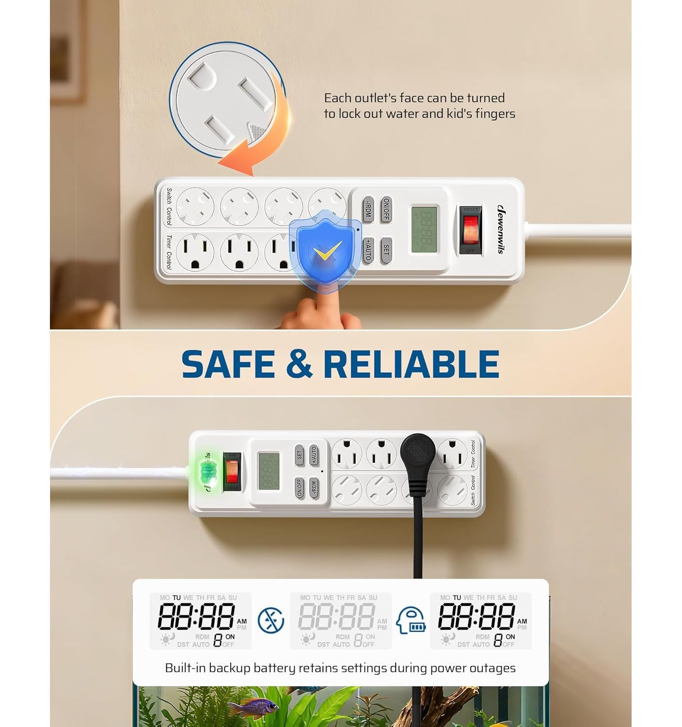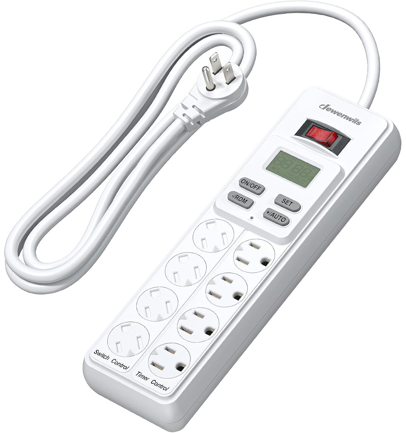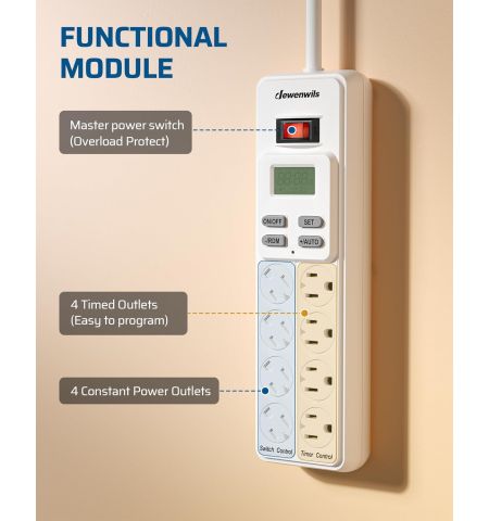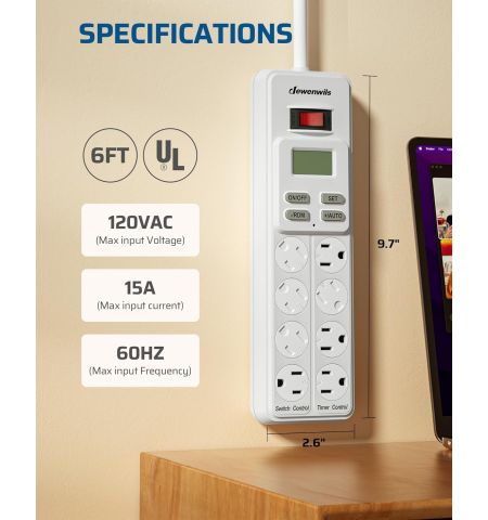 | Description | 8-Outlet Power Bar with Timer - 4 Outlets Timer Controlled - 4 Permanently ON/OFF outlets on left side to meet your usual needs - 6ft cord for flexible use and rotating outlet covers to block dust and prevent accidents - Mounting holes on the back make it easy to be mounted to the wall - Easy Programming with 4 Modes - Built-in Backup Battery - Save Money & Power - Wide Application - Smart USB charger station - Safe & Reliable - 7 Day & 20 On/Off Programs - On/Off switch - Brand New |
