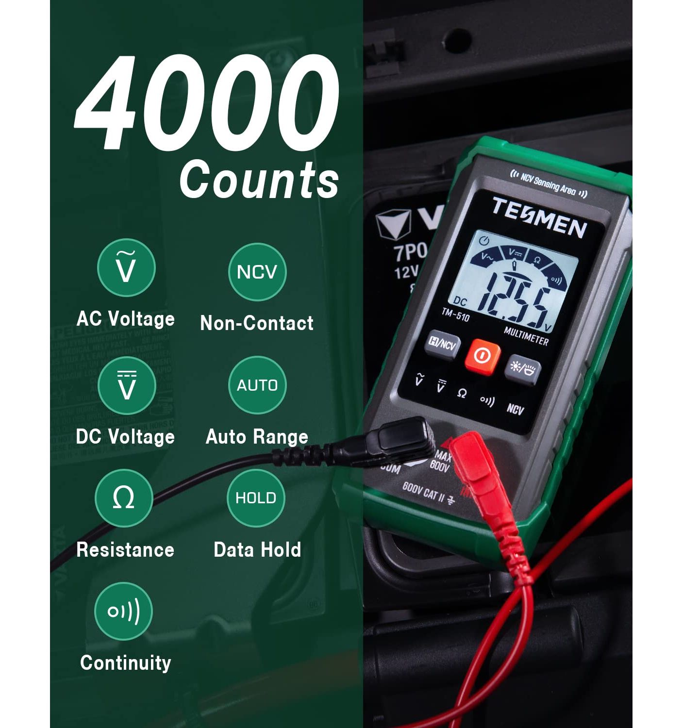 - CAT II 600V, 4000 counts, CE, and RoHS certified.
